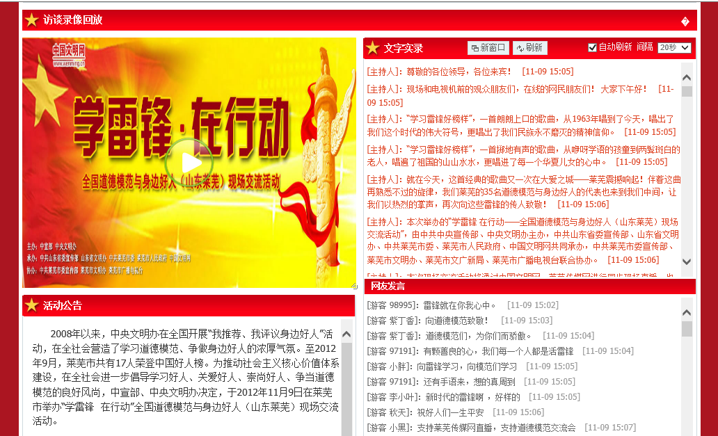 莱芜传媒网是经山东省政府新闻办公室批准、由莱芜市委宣传部主管、莱芜市广播电视局主办的专业新闻网站,是莱芜市广播电视局继莱芜人民广播电台、莱芜电视台、《赢在周刊》三家传统媒体之后,倾力打造的第四媒体。 上线当日,莱芜传媒网即利用LiveSoon在线访谈系统进行了一次“全国道德模范与身边好人(山东莱芜)现场交流活动”活动参与人数达到了上万人,整个直播访谈过程,稳定、清晰、流畅,并且整个直播利用P2P技术,有效的提升了服务器负载和节约了网络带宽。本次直播访谈成功举办后,网站负责人给了很高的评价,认为LiveSoon在线访谈系统,在高并发人数的情况下,仍可以保持在线访谈活动的平稳进行。